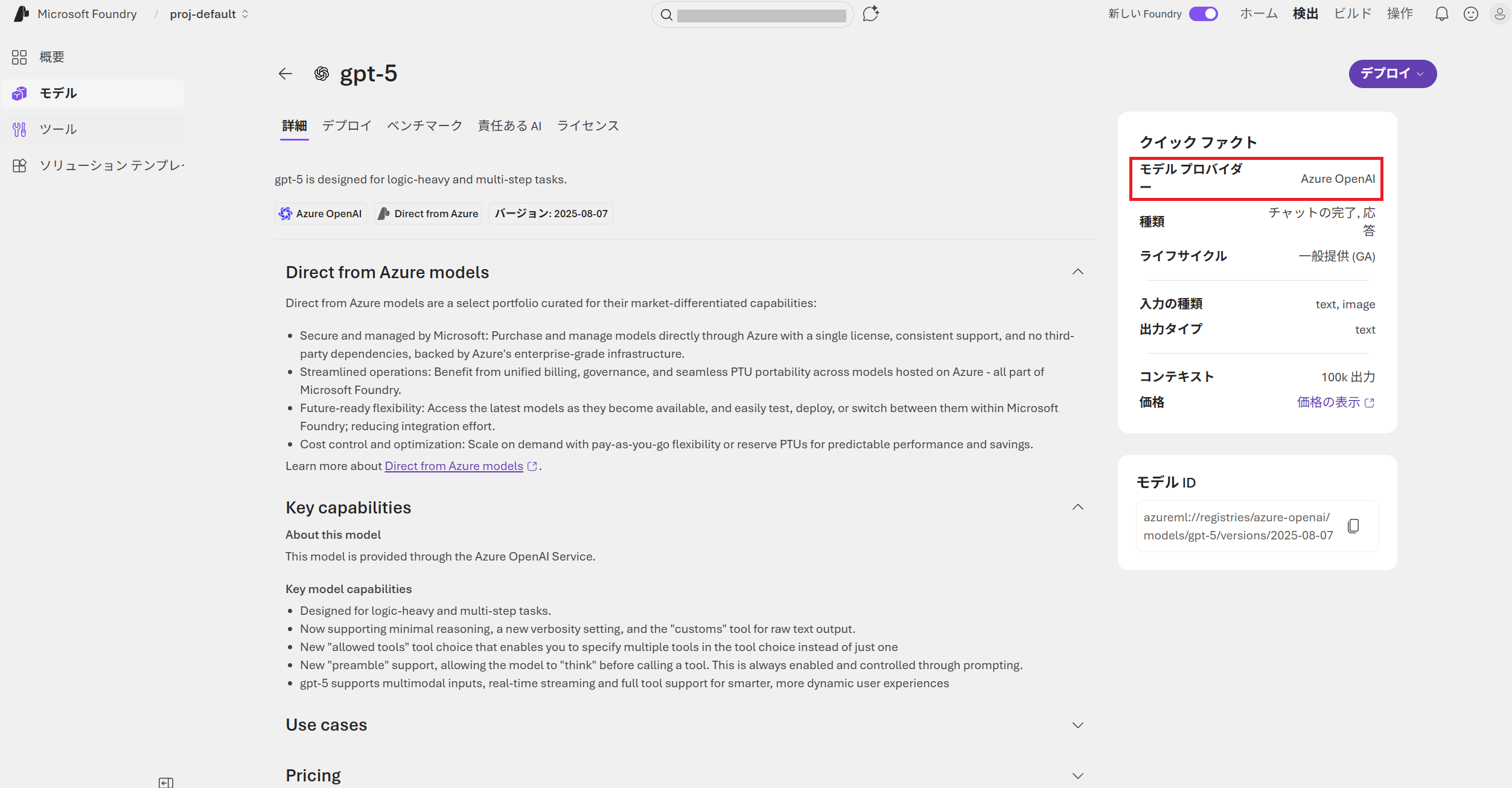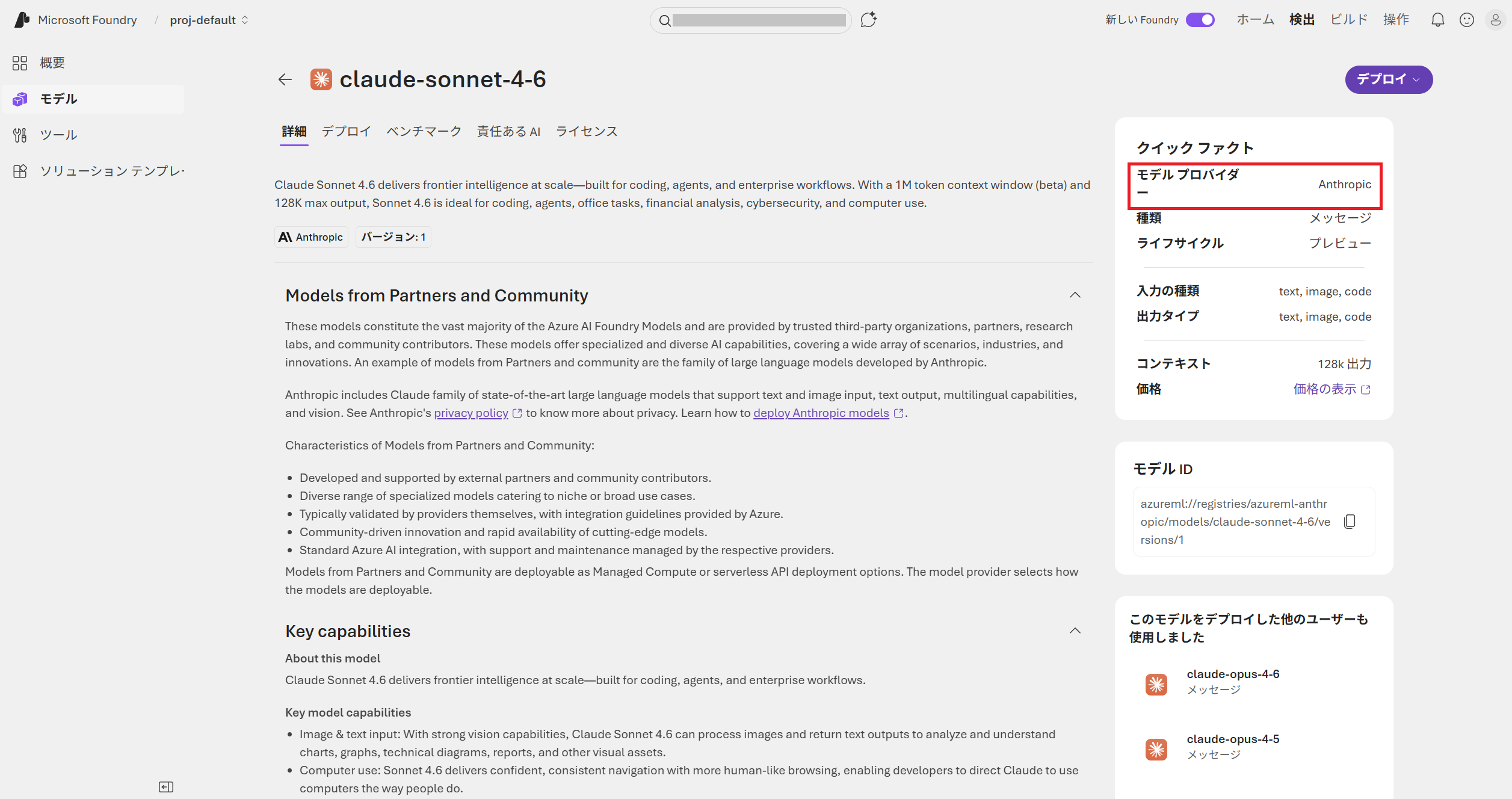 一方でMicrosoft Foundry Portal上にはMarketplaceという記載は一切出てきません。まずここで注目すべきなのがモデルプロバイダーの欄です。