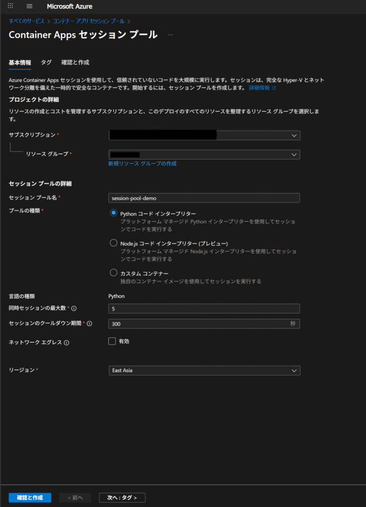 通常、Container Apps関連のリソースは「コンテナー アプリ」メニューから作成しますが、ダイナミックセッションは「Container Apps Session Pools」という別のメニューから作成します。これは、ダイナミックセッションが個々のコンテナーアプリとは独立した、再利用可能なサンドボックスインスタンスの「プール」を管理するリソースだからです。実際のAzure Portalの画面は以下の通りです。