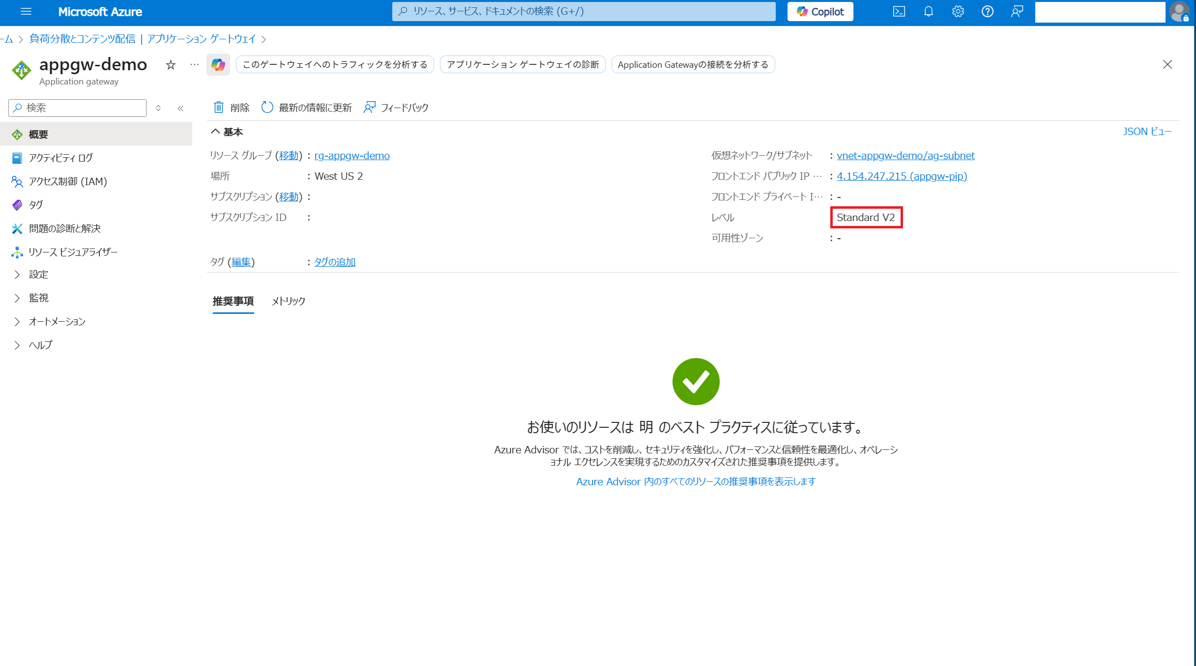 • SKU: Standard_v2またはWAF_v2 (Basic SKU はサポートされていません)