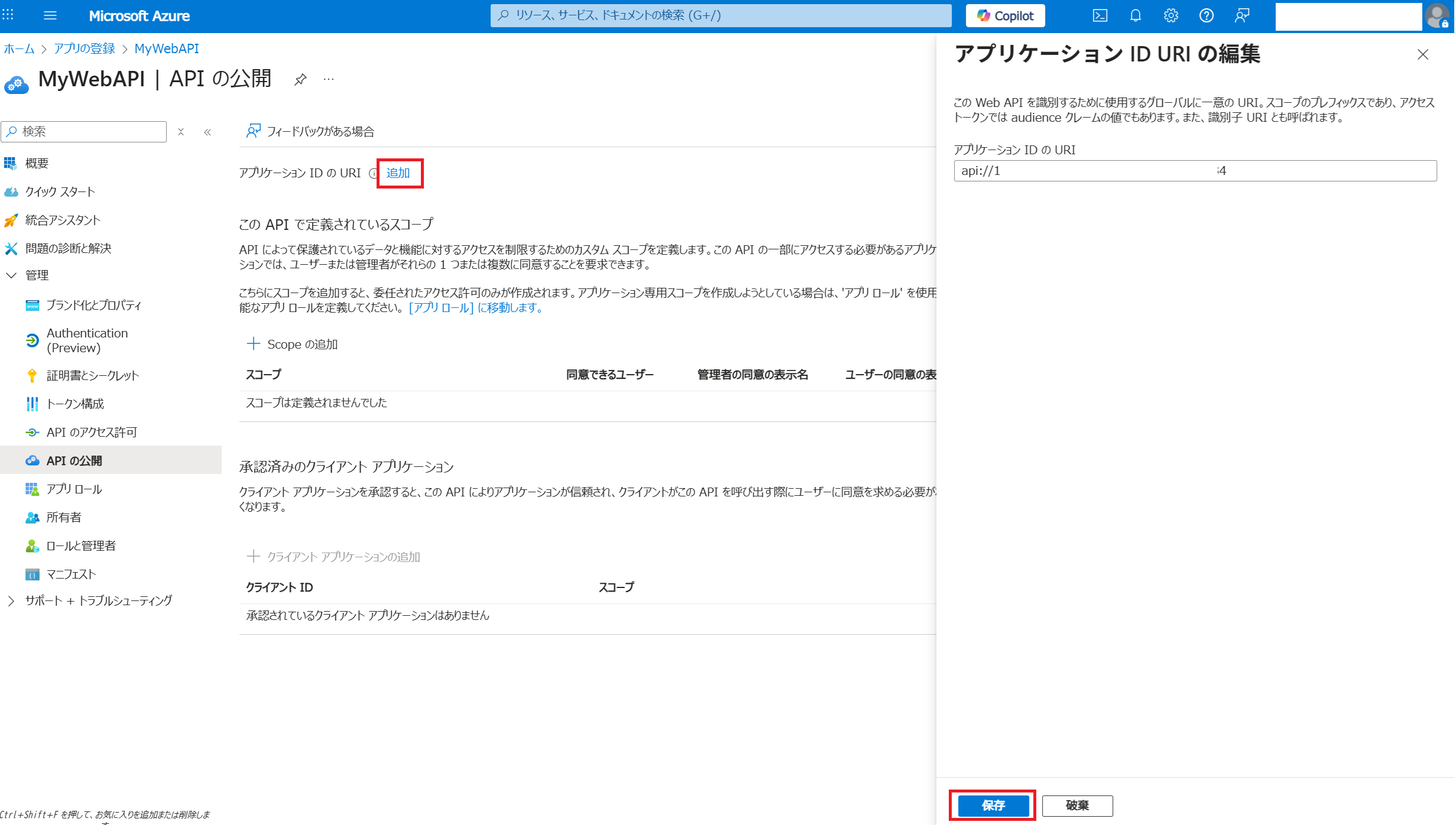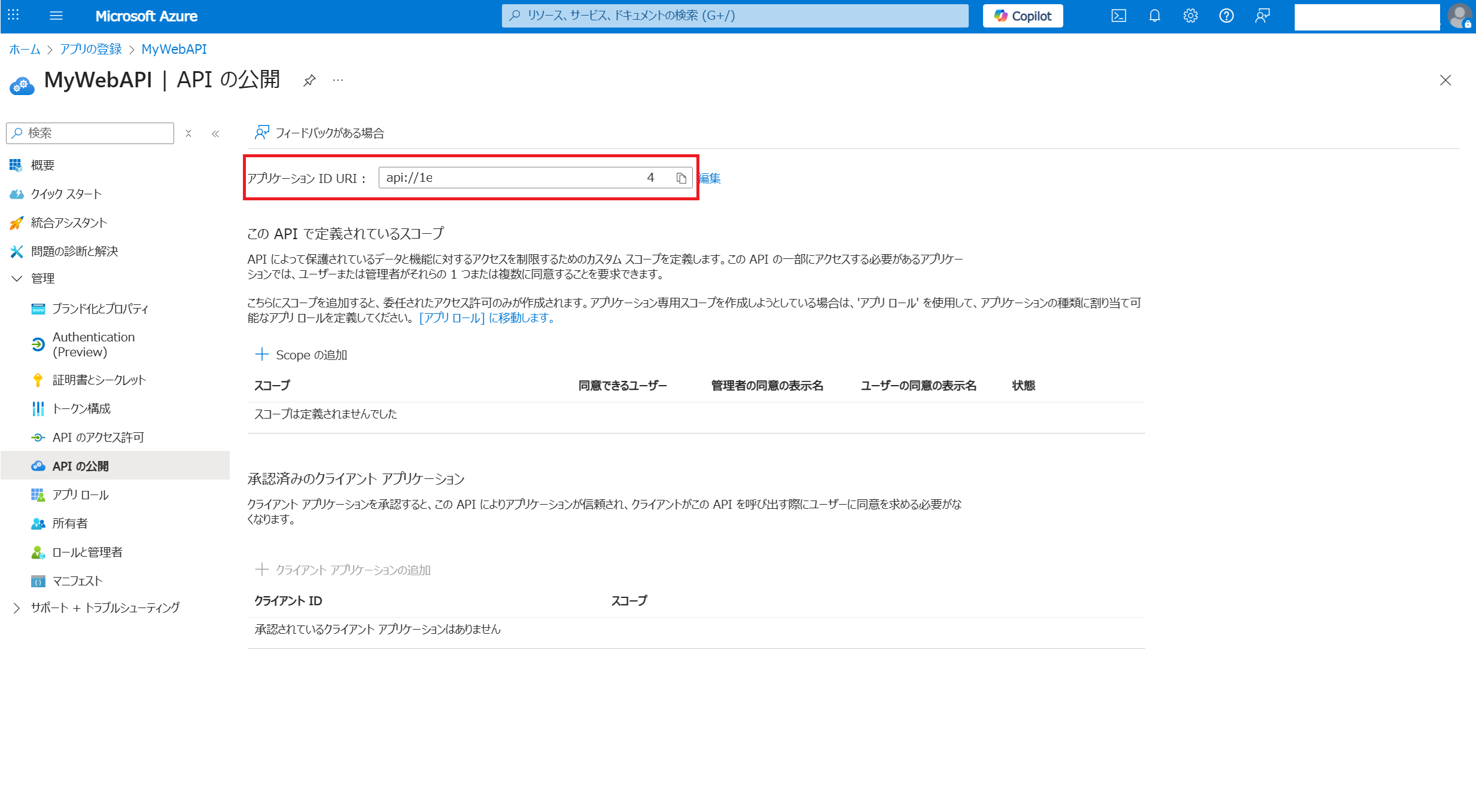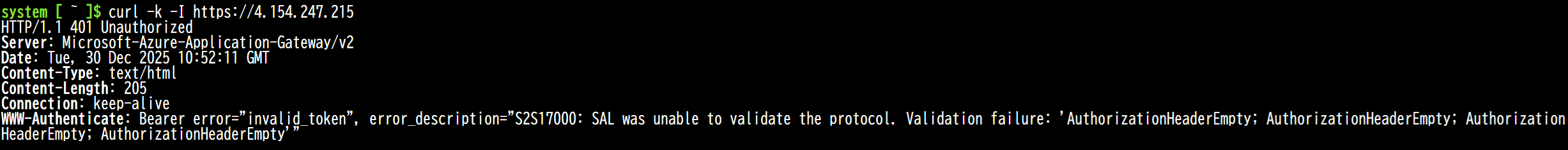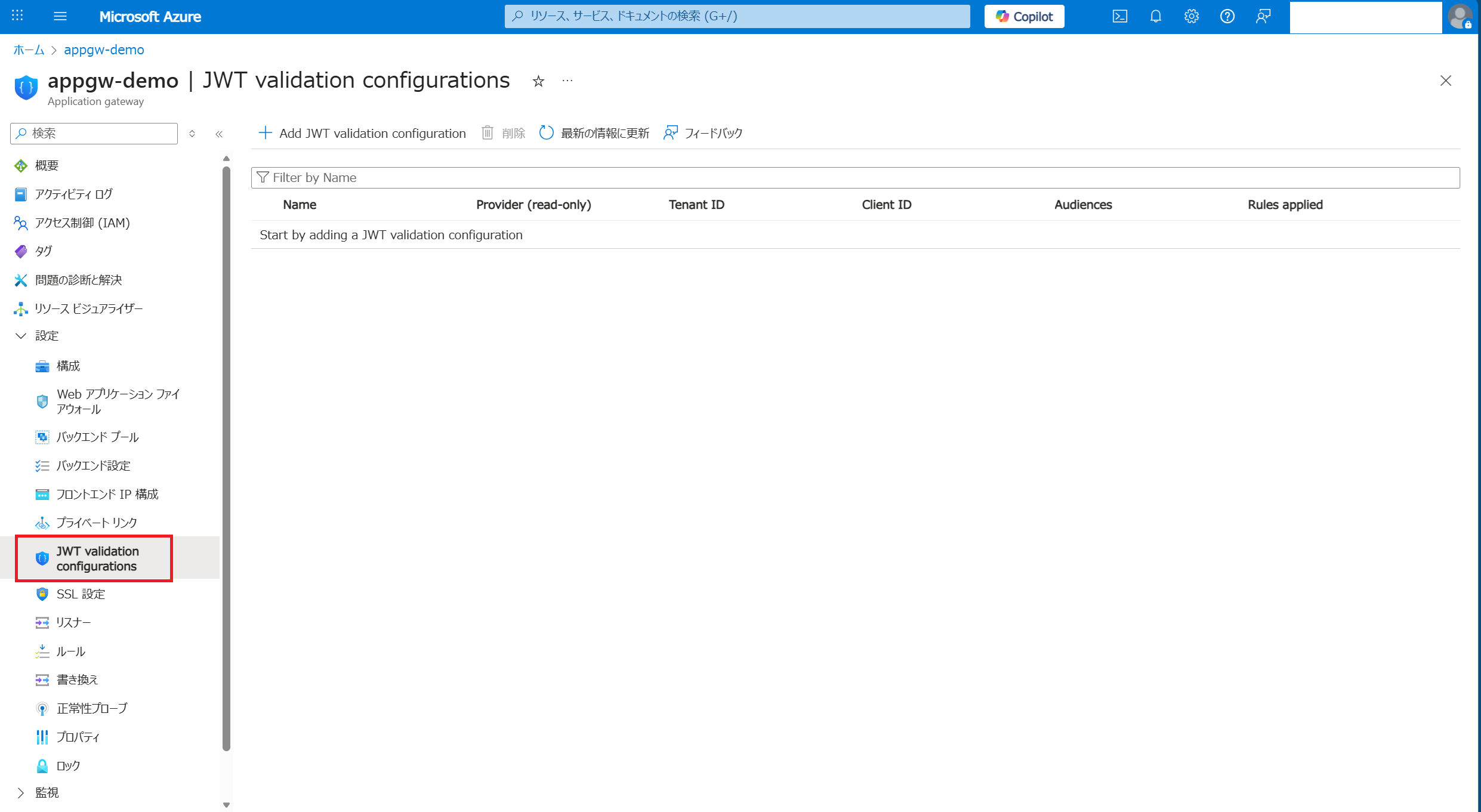 以下の形でデプロイが完了しました。 つづいてアプリケーションの登録をします。「新規作成」を選択します。 任意の名前を入力し「登録」します。 表示された「クライアントID」と「テナントID」をメモ帳等にコピーしておきます。 「アプリケーションID URIの追加」をクリックします。 「追加」から「保存」をします。 表示されたURLをメモ帳等にコピーしておきます。 つづいてJWT検証機能の有効化をします。現時点ではプレビュー機能のため専用URLが用意されています。専用URLから先ほどデプロイしたApplication Gatwayを表示します。Settings内に「JWT validation configurations」メニューが表示されます。 「+Add JWT validation configuration」をクリックし必須事項を入力後「Add」します。AudiencesはアプリケーションID URIです。 設定が完了したのでどのように動作をするのか実際に試してみます。 トークンを取得せずにApplication GatewayのパブリックIPにアクセスすると401エラーが返ってきます。 トークンを取得するとアクセスすることができます。Application GatewayでJWT検証を終端できていることが分かります。