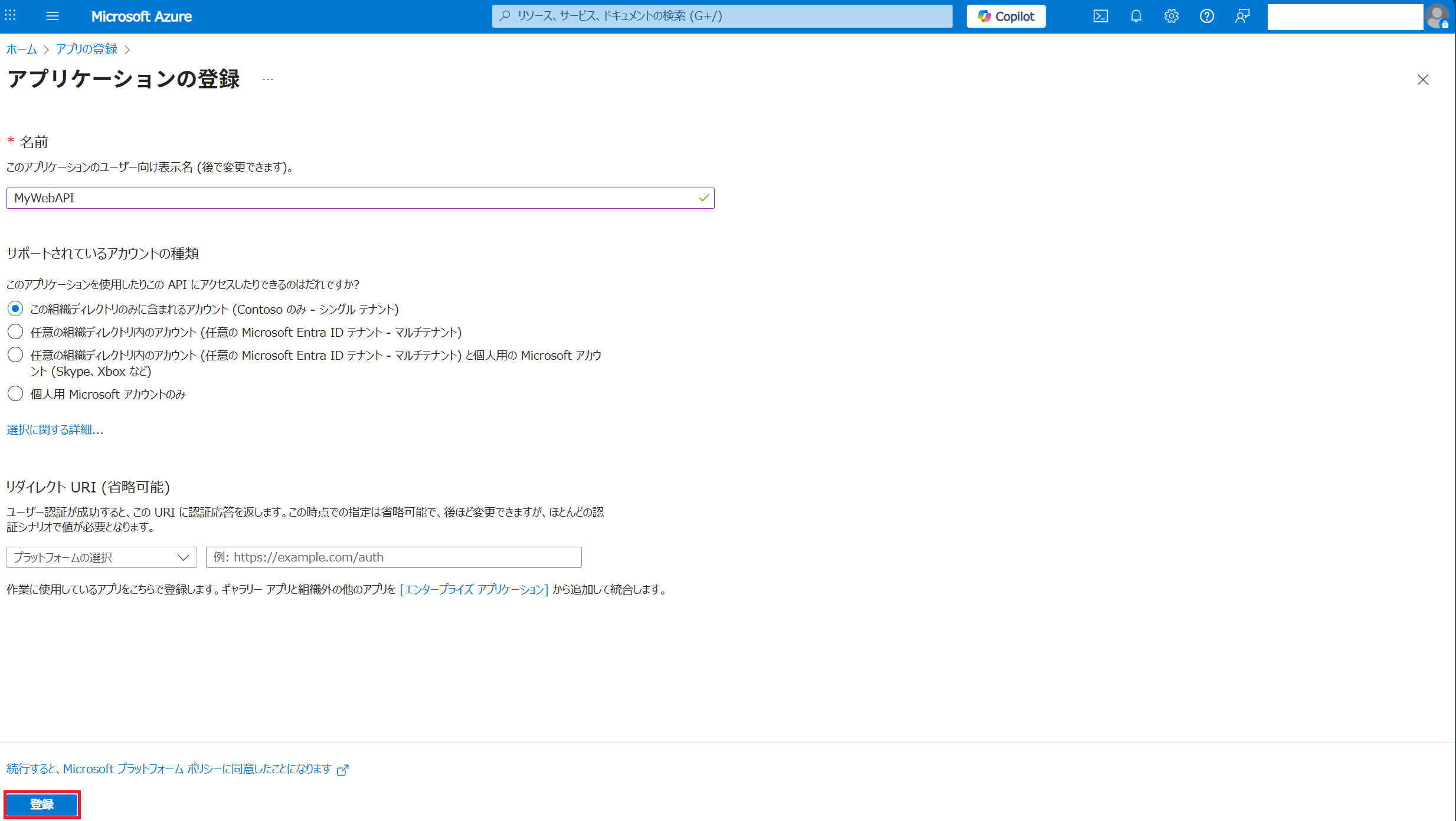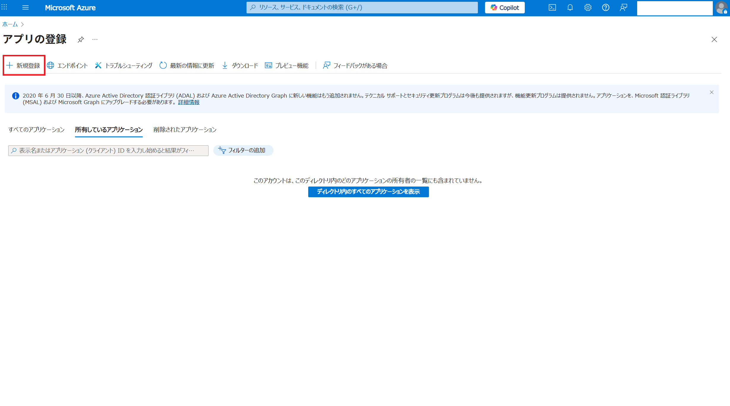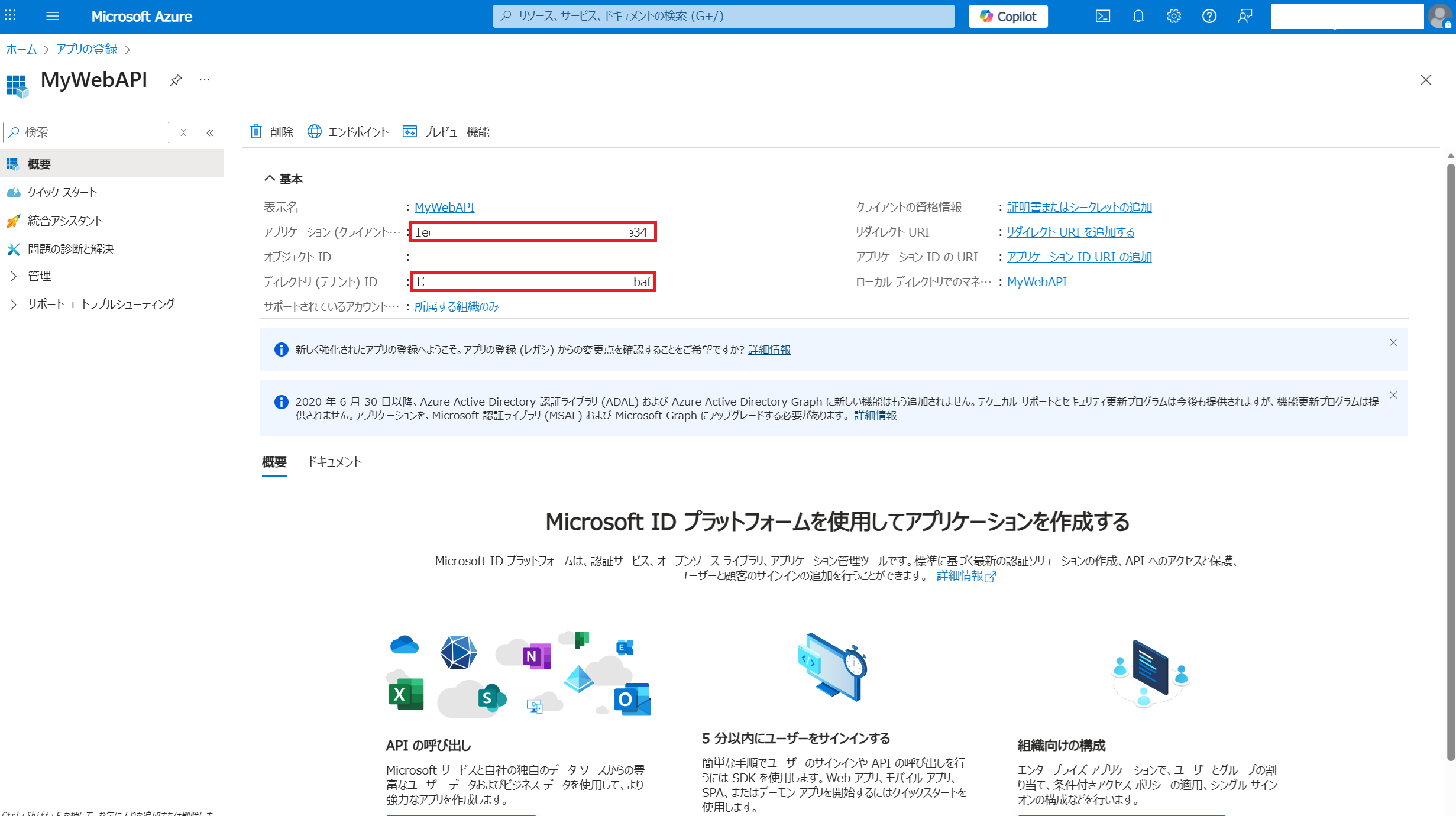 以下の形でデプロイが完了しました。 つづいてアプリケーションの登録をします。「新規作成」を選択します。 任意の名前を入力し「登録」します。 表示された「クライアントID」と「テナントID」をメモ帳等にコピーしておきます。 「アプリケーションID URIの追加」をクリックします。 「追加」から「保存」をします。 表示されたURLをメモ帳等にコピーしておきます。 つづいてJWT検証機能の有効化をします。現時点ではプレビュー機能のため専用URLが用意されています。専用URLから先ほどデプロイしたApplication Gatwayを表示します。Settings内に「JWT validation configurations」メニューが表示されます。 「+Add JWT validation configuration」をクリックし必須事項を入力後「Add」します。AudiencesはアプリケーションID URIです。 設定が完了したのでどのように動作をするのか実際に試してみます。 トークンを取得せずにApplication GatewayのパブリックIPにアクセスすると401エラーが返ってきます。 トークンを取得するとアクセスすることができます。Application GatewayでJWT検証を終端できていることが分かります。