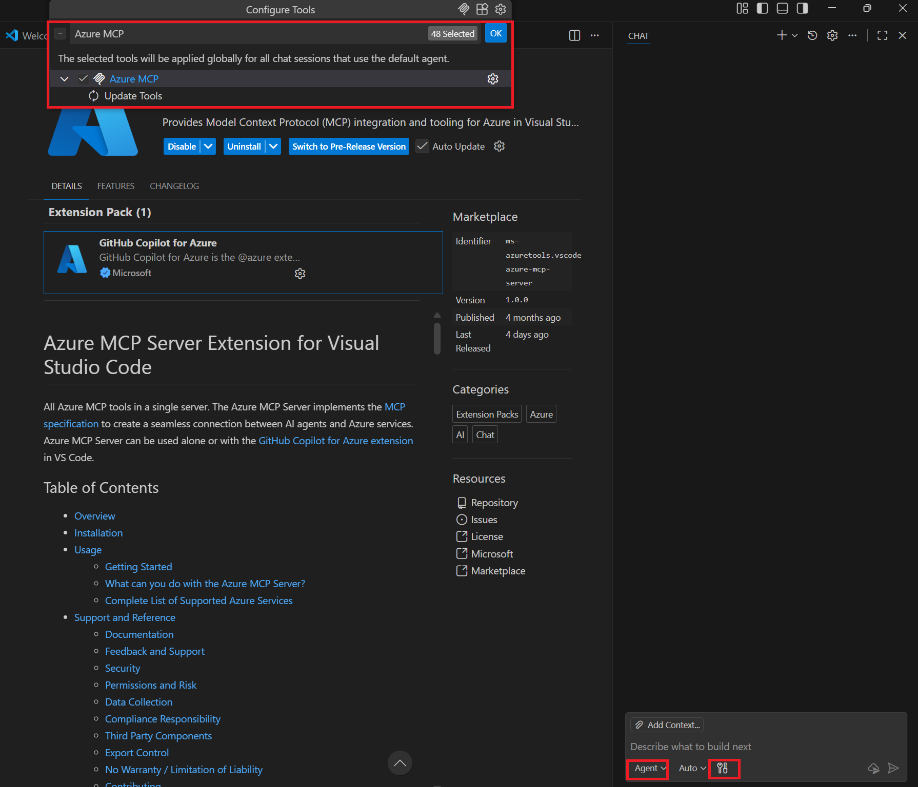 「Agent」->「ツールアイコン」を選択後「Azure MCP」が表示されることを確認しチェックボタンをクリックします。