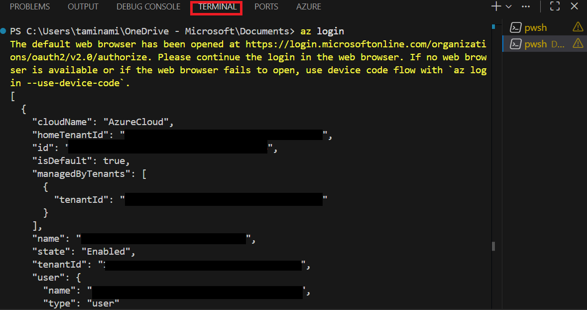 ローカルのVS CodeからAzureにログインをします。Azure CLIがインストールされていればVS Codeのターミナルから操作をすることができます。