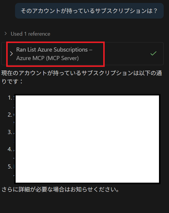 自然言語の入力内容を元にAzure MCP Serverに問い合わせるべき質問は自動で振り分けをしてくれるので便利ですね。