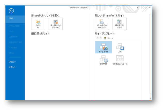 インストールが完了したら、SharePoint Designerを起動してみましょう。