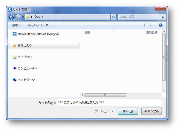 上記画面が表示されるので、[サイトを開く]を選択して[サイト名]に対象サイトのURLを入力し、[開く]を選択して下さい。