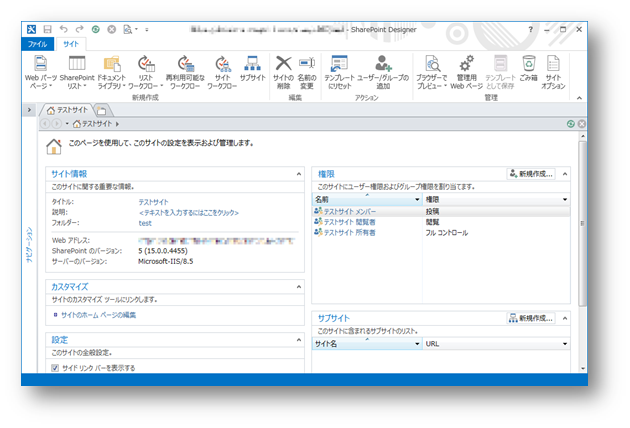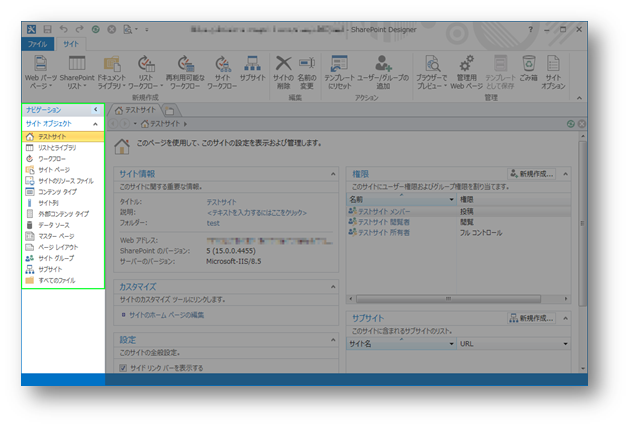 初期画面で、まずは上のリボンメニューですが、大きく分けて以下の4つになります。(※SharePoint Designerでアクセスしている箇所によってリボンメニューは変動し、初期画面ではサイトに対しての操作メニューとなります)