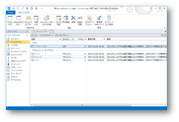 - コンテンツ(例えばページやライブラリ)などをここから作成することができます。