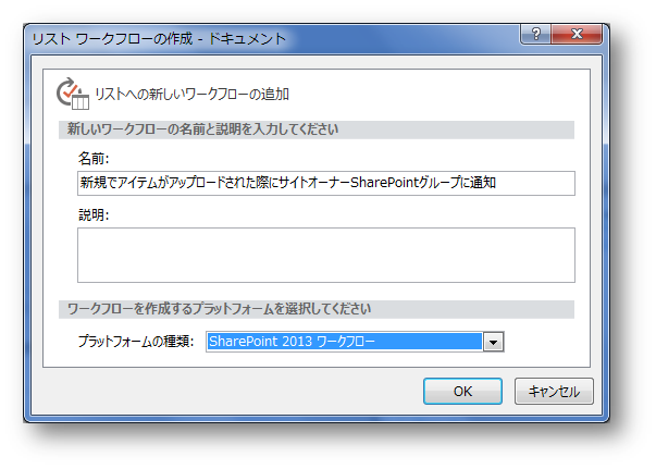 ワークフローの作成画面が表示されるので、名前を付けて[OK]を選択して下さい。プラットフォームの種類はSharePoint 2013 ワークフローのほうができることが多いので、とりあえずはSharePoint 2013 ワークフローを選択して下さい。(MicrosoftもSharePoint 2013 ワークフロー推奨とのこと)