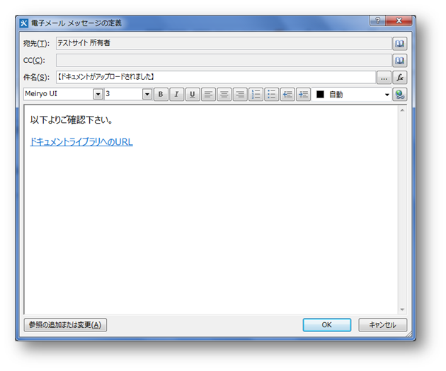 電子メール メッセージの定義が表示されるので、必要な情報を選択/入力後、[OK]にて完了して下さい。 (宛先/CCは右側の辞書アイコンから送付先を検索できます。ここではSharePointグループも選択することが可能です)