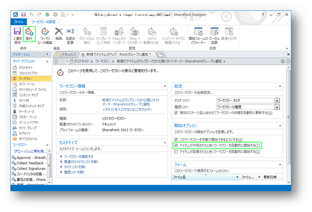 “開始オプション”にて[アイテムが作成されたときにワークフローを自動的に開始する]にチェックをいれ、後は左上の[発行]を選択すればワークフローの設置は完了です。あとはワークフローを設置したドキュメントライブラリにファイルをアップロードし、通知メールがくれば成功です。