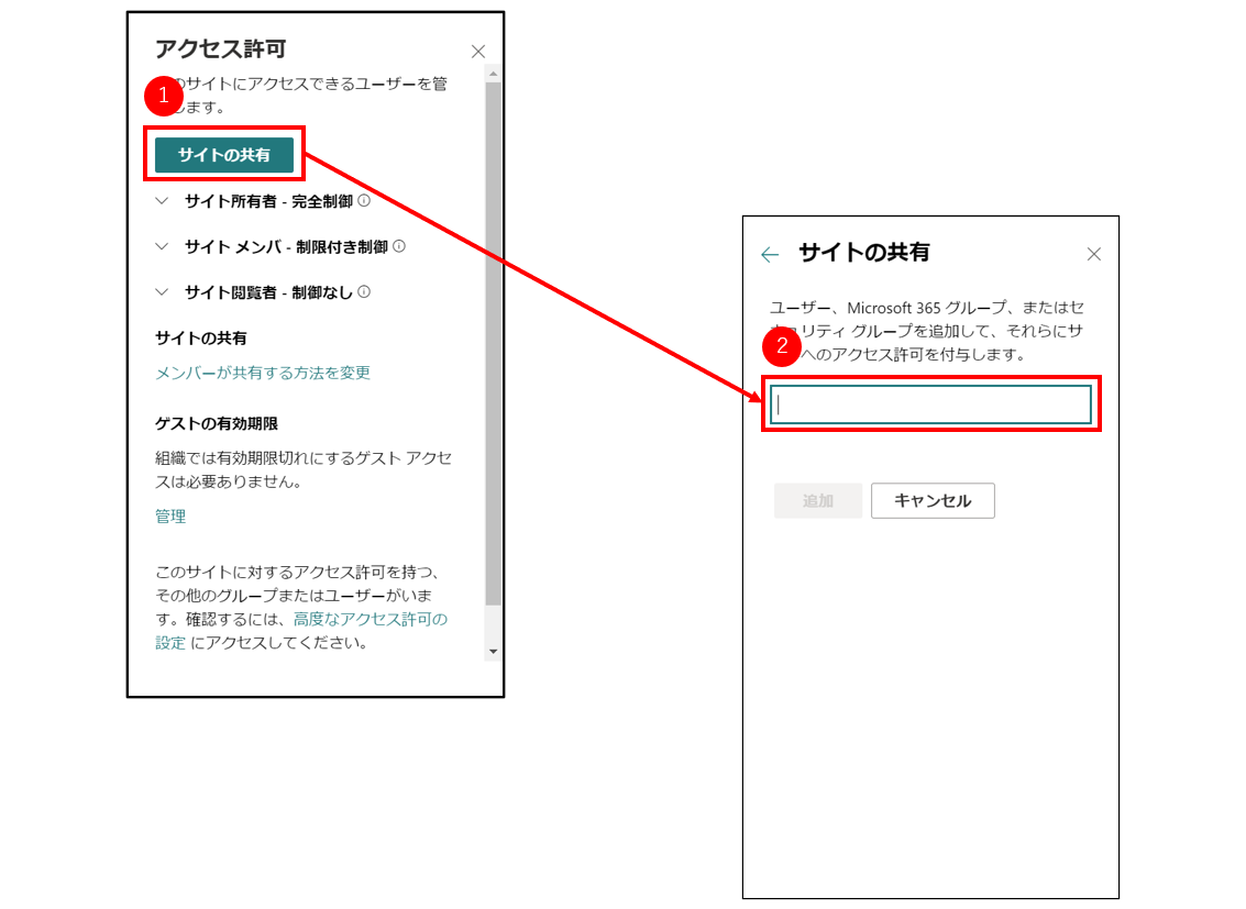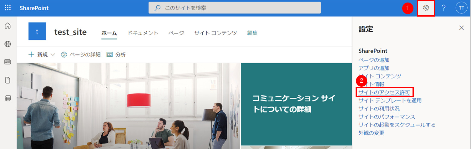 - 共有したいSharePointサイトにアクセスし、アクセス権限を付与します。