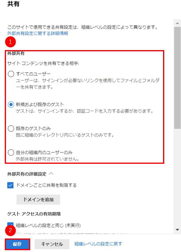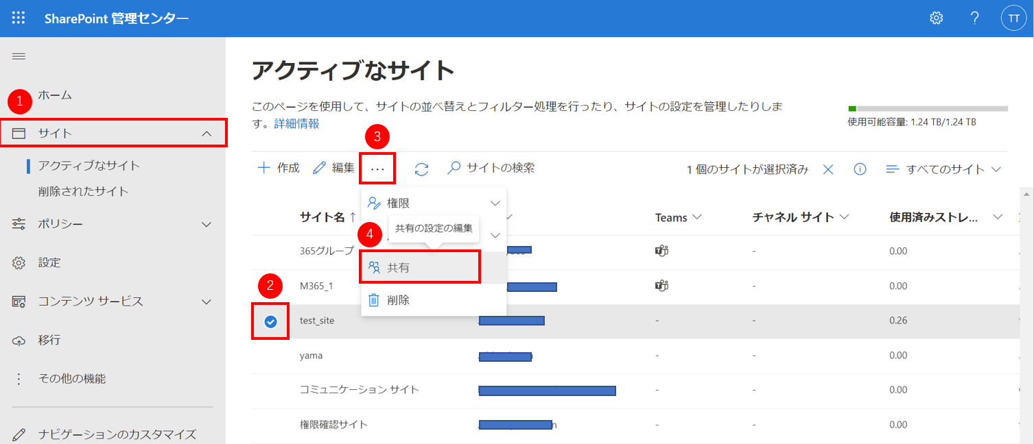 - まずはSharePoint管理センターにアクセスして、外部ユーザーに共有したいサイトの共有設定にアクセスします。