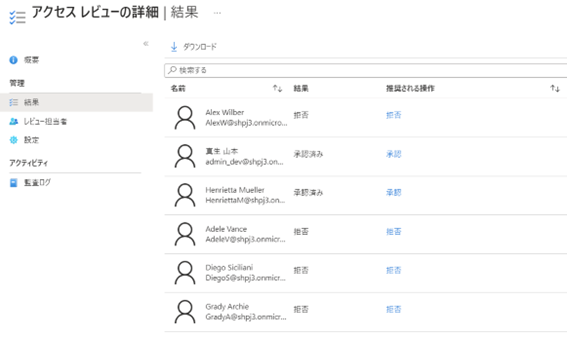 アクセスレビュー担当者がここからアクセス許可を残すかどうかを判断していくことができます。