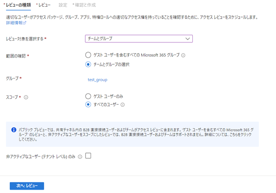 レビューの対象はグループのレビューをしたいので、「チームとグループ」。範囲は一つのグループのレビューを行いたいので、「チームとグループの選択」。