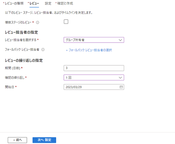 担当者や期間は自由に選べますが、 今回は担当者にグループ所有者、期間は3日間、繰り返し回数は1回、開始日は実施したい日付を入力します。④ アクセスレビューの設定