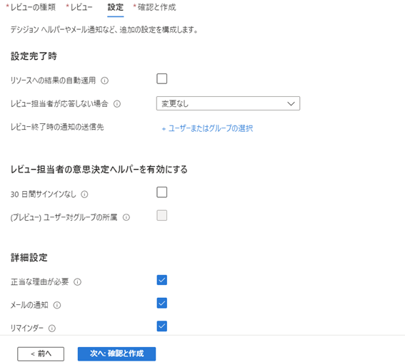 アクセスレビューの設定は、30日以上サインインしていないユーザを確認したいだけなので、初期設定のままにしておきます。アクセス許可の自動削除等を行いたい方はここで設定してください。