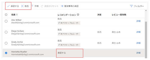 30日間サインインしていないユーザには「拒否」、サインインしているユーザには「承認」がアクセスレビューから提案されます。