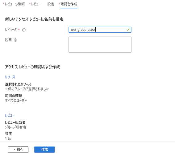 最後にアクセスレビューの名前と設定の確認を行い、作成完了です。Azure AD アクセスレビューの実施