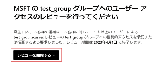 アクセスレビューを作成し、実施期間になると、自動でアクセスレビューが始まります。アクセスレビューの状況などはアクセスレビュー担当者にメールが届くので、そこから「レビューを開始する」を押下して、確認していく形になります。