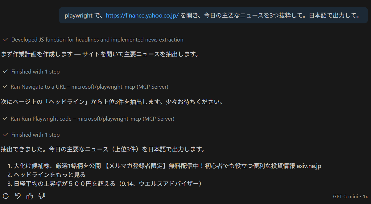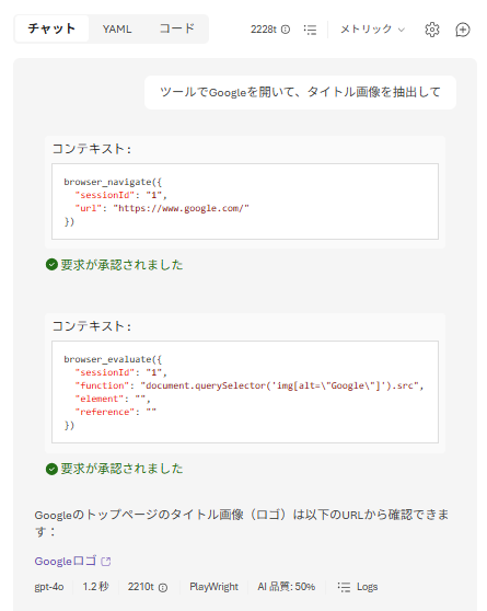 設定したエージェントで Playwright を実行するチャットを行うことで、自作の Playwright MCP が起動することを確認できました。