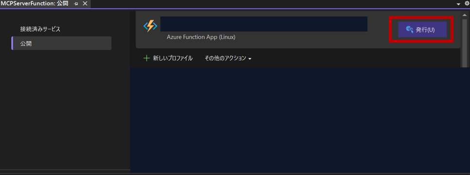 | 1 2 3 4 5 6 7 8 9 10 | {     "servers": {         "my-mcp-server-Azure": {             "type": "sse",             "url": "https://localhost〇〇〇.net/runtime/webhooks/mcp/sse"         }     } } |