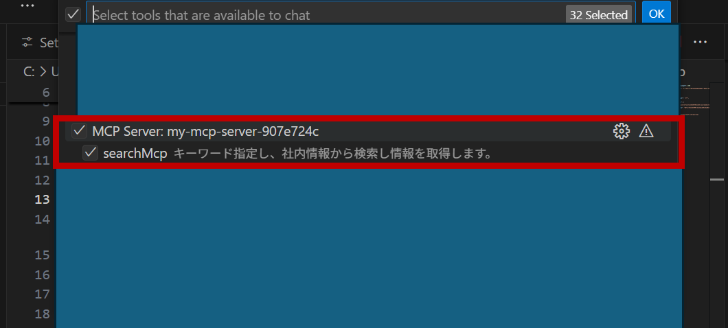 | 1 2 3 4 5 6 7 8 9 10 11 12 13 | {     "servers": {         "my-mcp-server-Azure": {             "type": "sse",             "url": "https://〇〇〇.azurewebsites.net/runtime/webhooks/mcp/sse",             "headers": {                 "x-functions-key": "<取得したキー>"             }         }     } } |