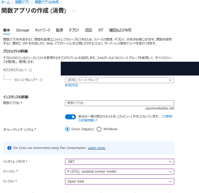 Azureリソース作成を作成します。現在Azure FunctionsでMCPサーバーを立ち上げる際、オペレーションシステムはLinuxが推奨されてます。