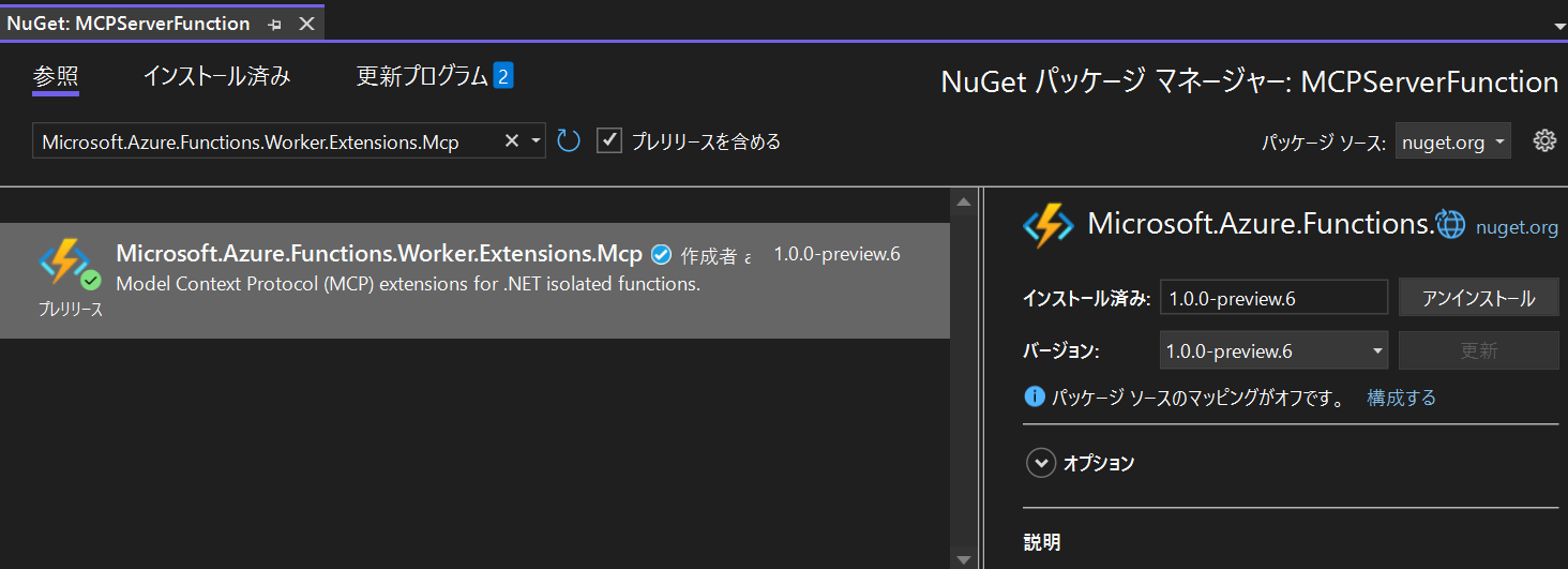 | 1 2 3 | Microsoft.Azure.Functions.Worker.Extensions.Mcp --version 1.0.0-preview.6 |