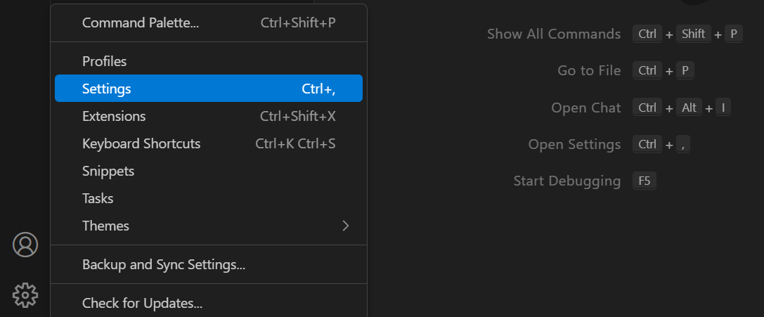 Visual Studio Code左下の設定ボタンからSettingsを選択します。