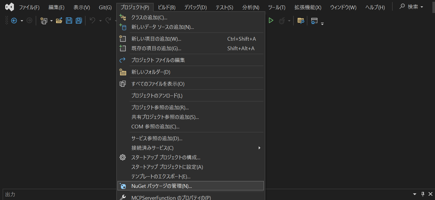 プロジェクトが立ち上がったら、上部メニュー「プロジェクト」→「NuGet パッケージの管理」を選択します。