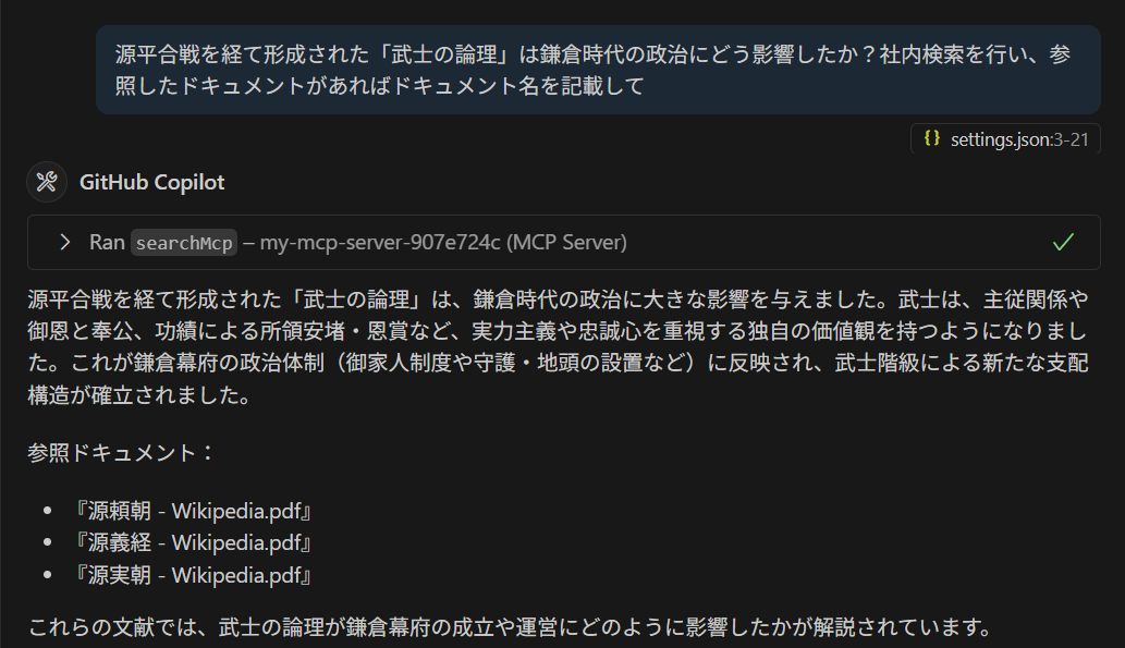 これでMCP を利用したチャットが可能になります。今回は以前の記事で使用した武将データのインデクサを使って確認しました。(Gemini産DeepResearchのオープンソースをAzure環境で再構築!社内文書のディープリサーチを作る手順 – 株式会社ディープコム)