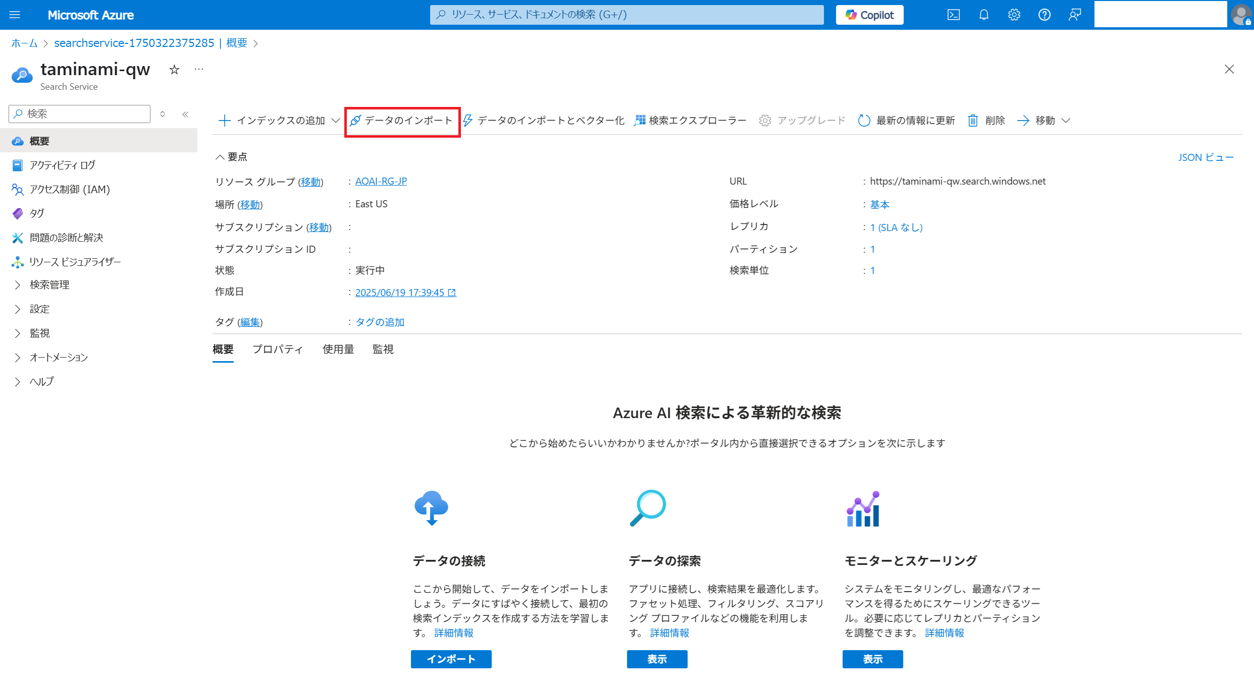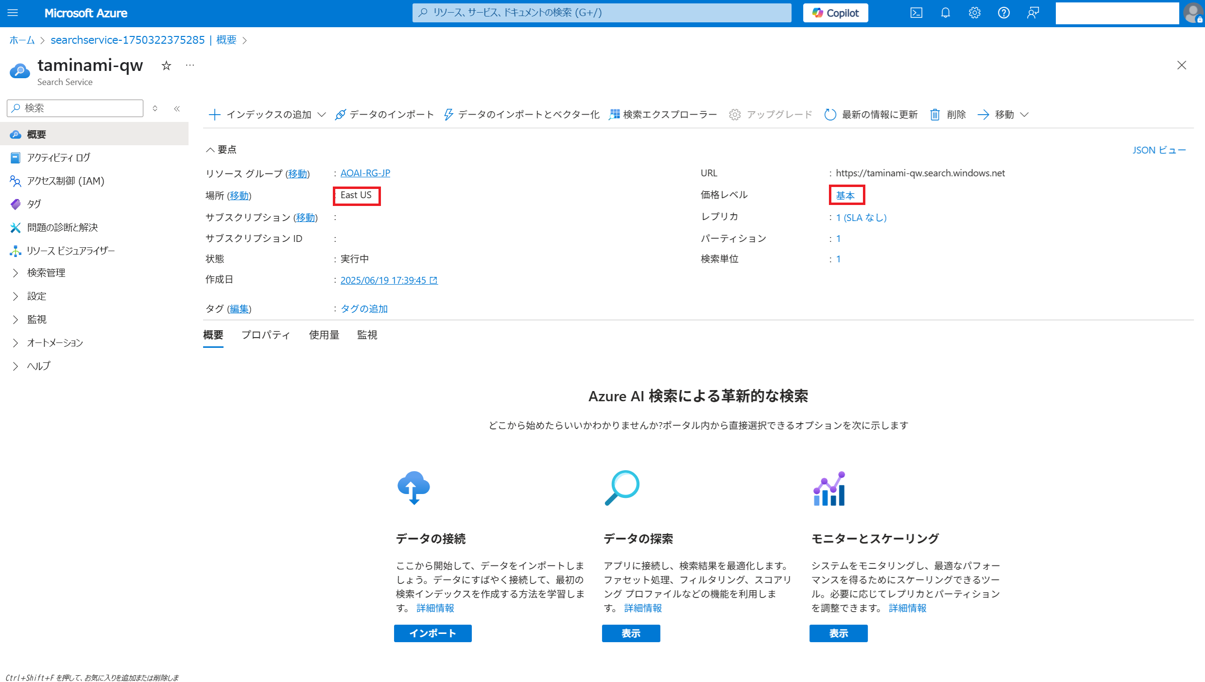 それでは早速試してみましょう。Azureポータルにサインインをし、Azure AI SearchをBasicプラン以上でデプロイします。本記事投稿時点では米国東部・北ヨーロッパ・東南アジアリージョンのみで利用可能な機能になっていますので、最新情報は公式ドキュメントの情報を確認しながら進めてください。