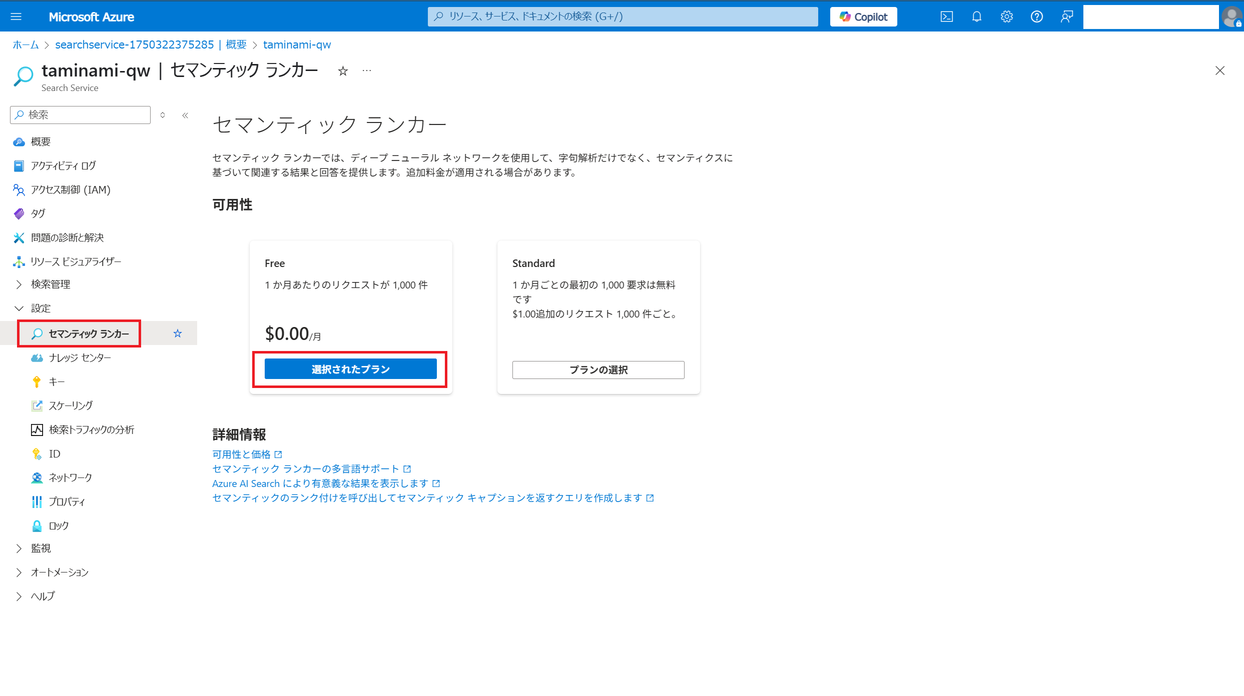 「セマンティックランカー」メニューを開き「選択されたプラン」と表示されていれば有効化されています。デフォルトでは無料プランが有効化されているので、有償プランを使用したい方は「プランの選択」をクリックしてください。