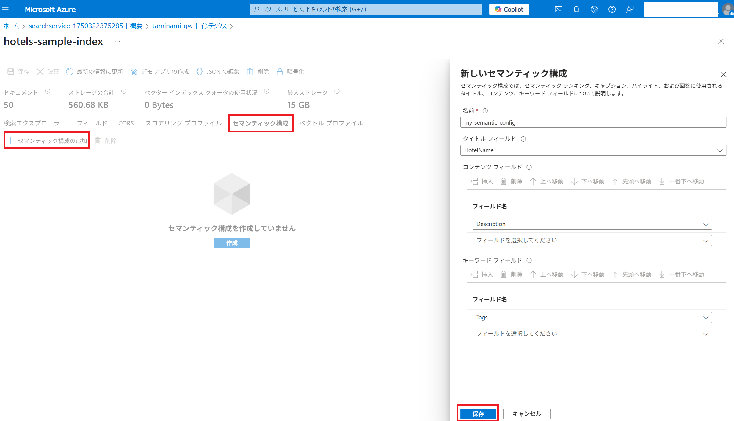 「セマンティック構成」から「+セマンティック構成の追加」をクリックし、以下のように入力をして「保存」します。