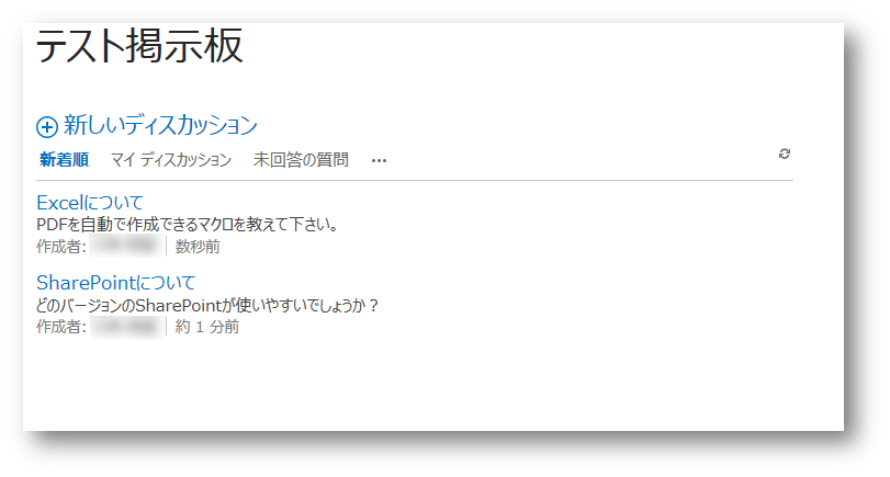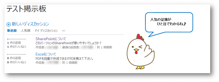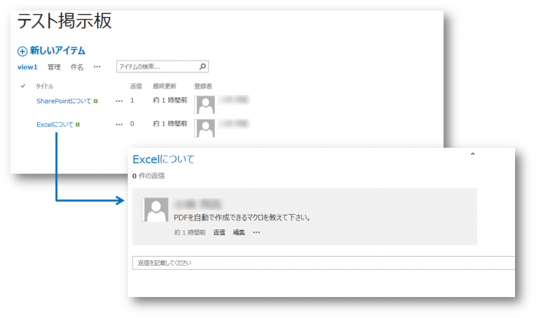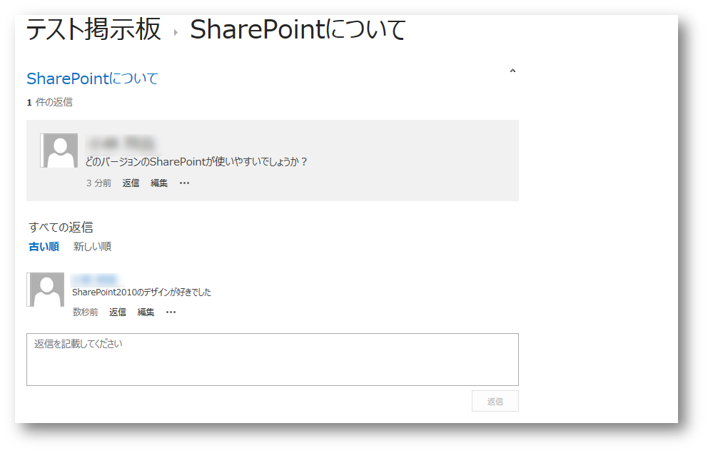 このリストは投稿した質問や議題(新規アイテム)に対して回答やコメントすることができるディスカッション形式で使用することができます。