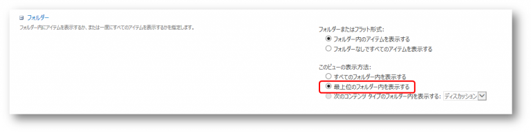 また、自身で作成したビューを規定ビューに設定する場合はビューの編集画面で「フォルダー」の「最上位のフォルダー内を表示する」を選択しないと、アイテムのタイトルをクリックした後にフラット形式ビューへ遷移しないので注意してください。