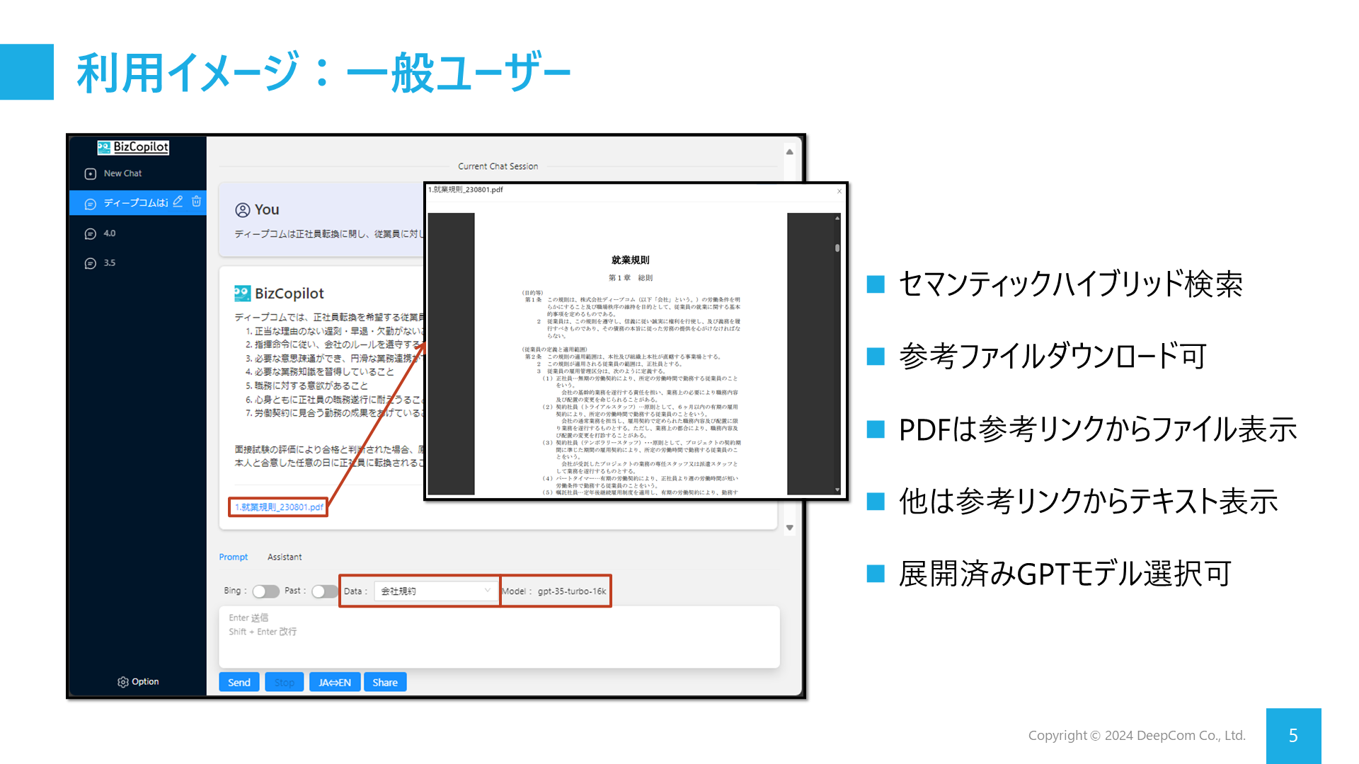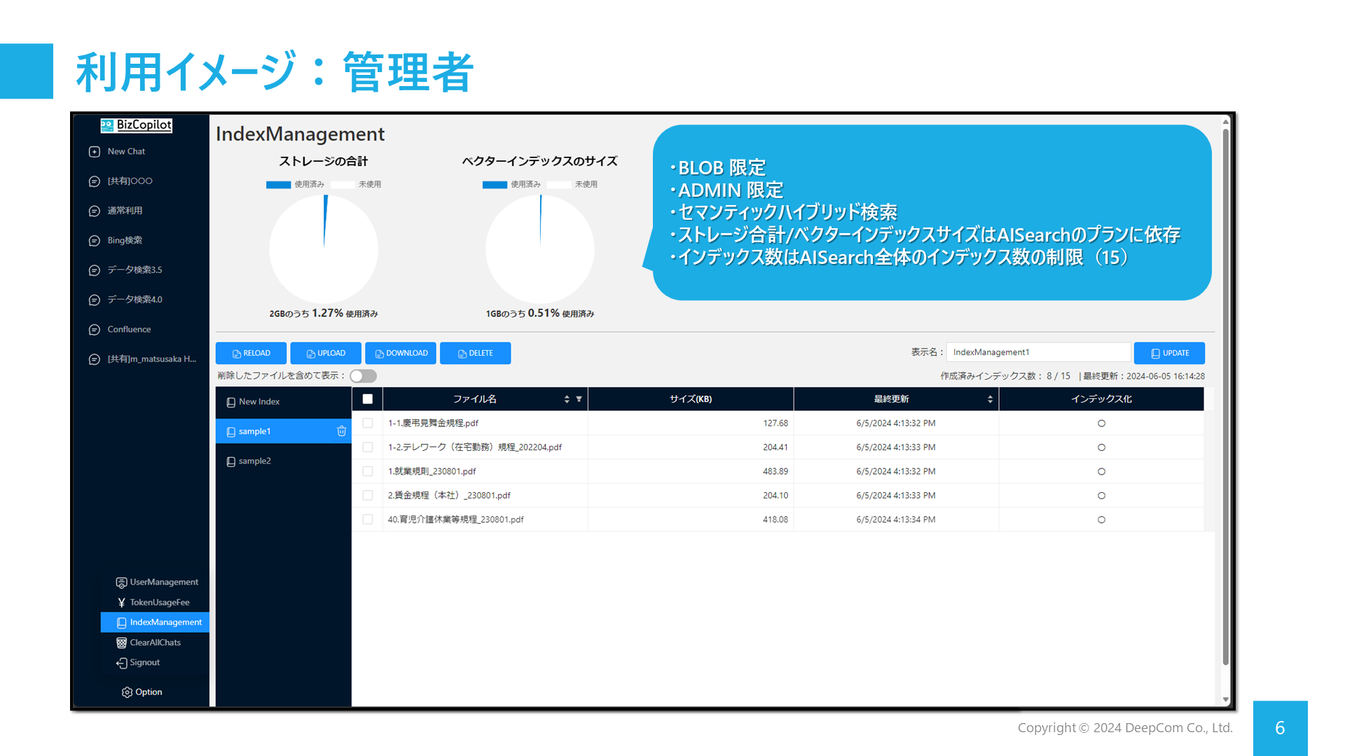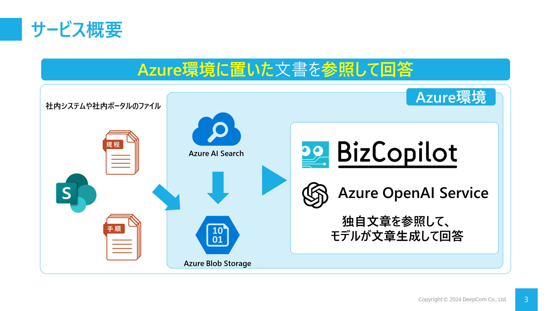 本資料はAzureOpenAIを利用した生成AIソリューション「BizCopilot」にRAG(BlobStorage)を追加するサービスのご説明資料となります。