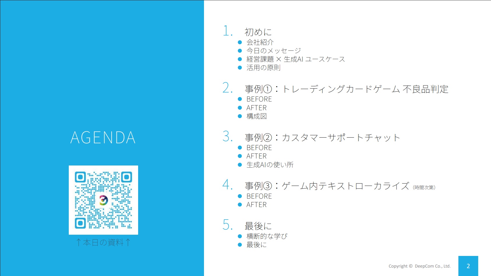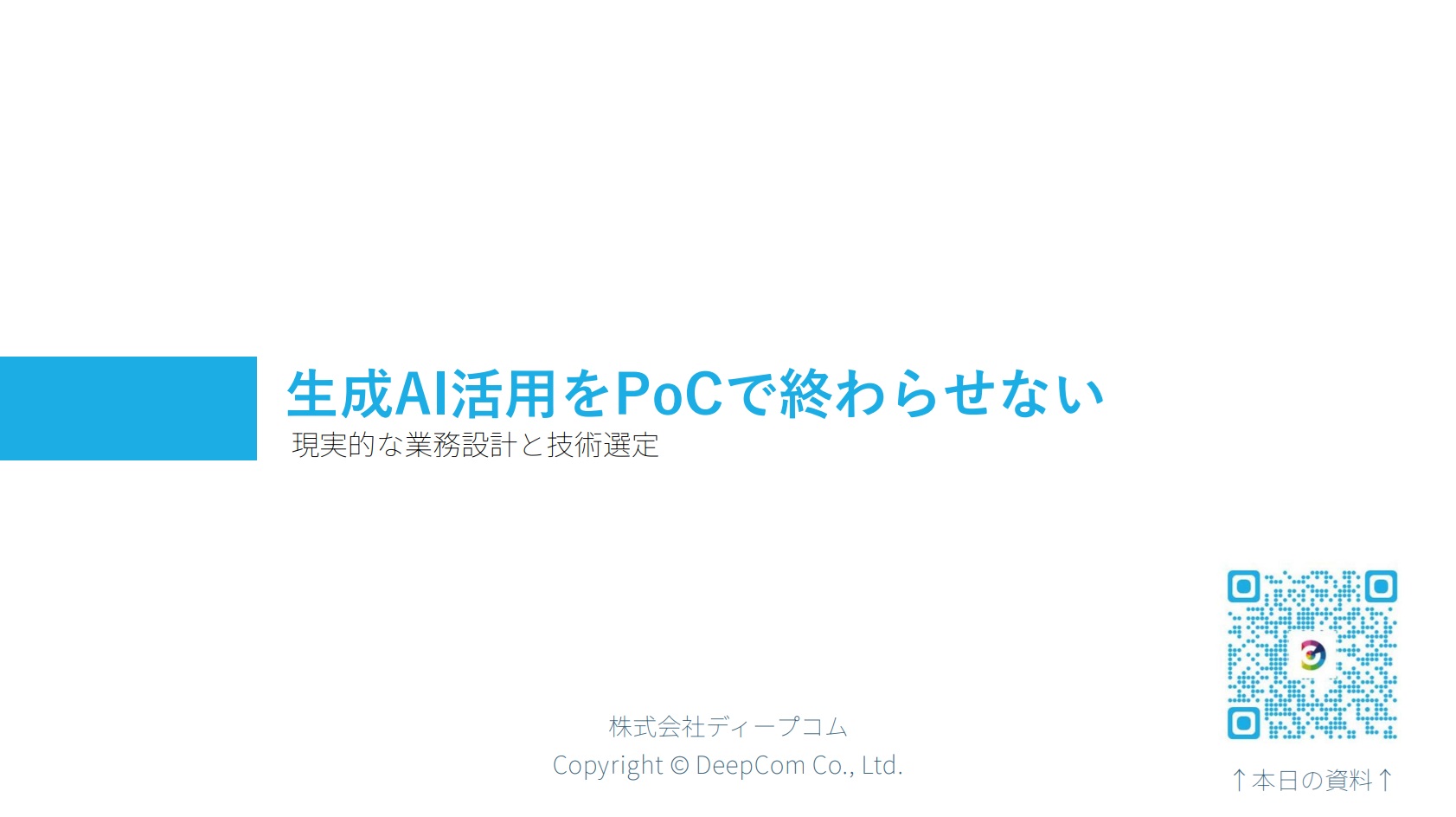 また、弊社ではAI関連の記事も多数記載しておりますので、よろしければこちらも合わせてご覧ください。 ブログ:DeepCom Blog