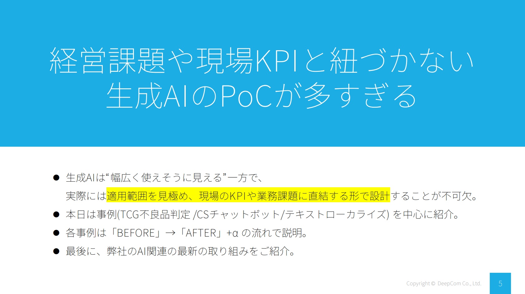本資料は生成AIをPoCで終わらせず実運用、業務課題を解決した実例を紹介しております。