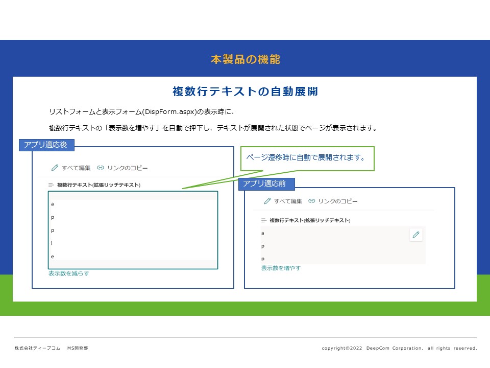 SharePoint リストアイテム拡張機能Webパーツは リストアイテムの編集画面の動作を変更したり、 複数行テキストを展開状態で表示するWebパーツとなっております。