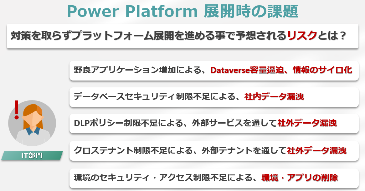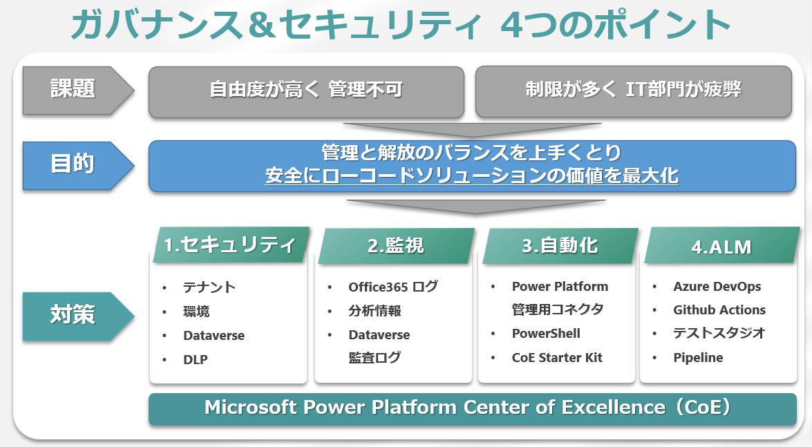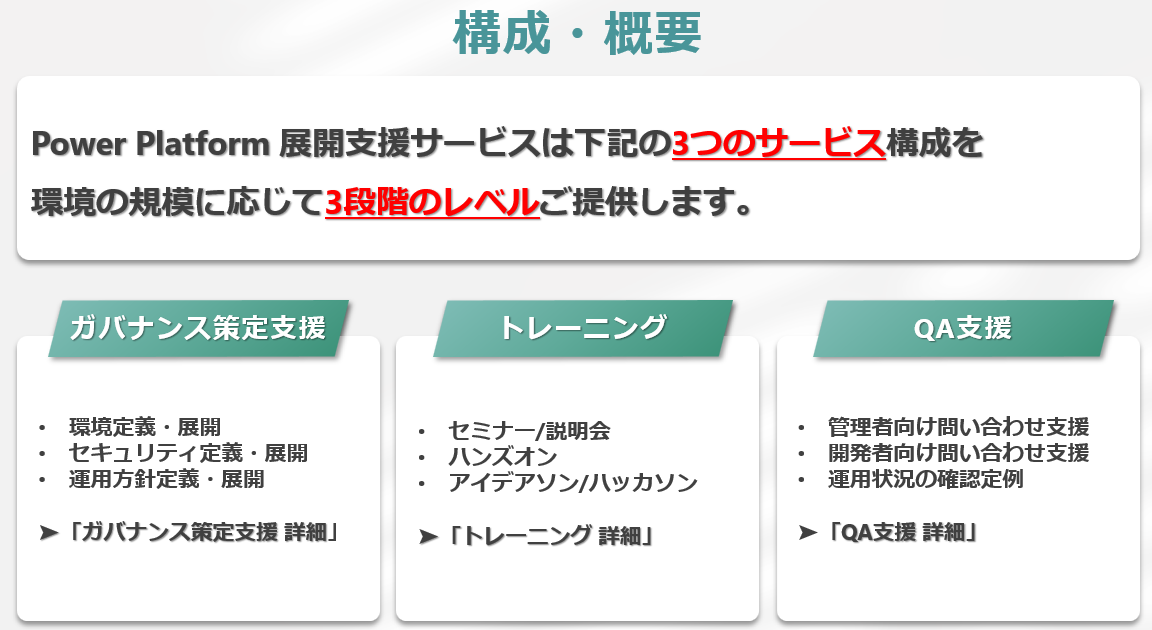 ローコード・ノーコード プラットフォームである Microsoft社のPower Platformを用いた、導入支援(ガバナンス)サービスのご紹介資料となります。 Power Platform展開時の課題やガバナンス&セキュリティのポイントなどを記載しています。 ガバナンス策定支援/トレーニング/QA支援をセットとし、お客様の環境に合わせて3段階のレベルで提供しています。