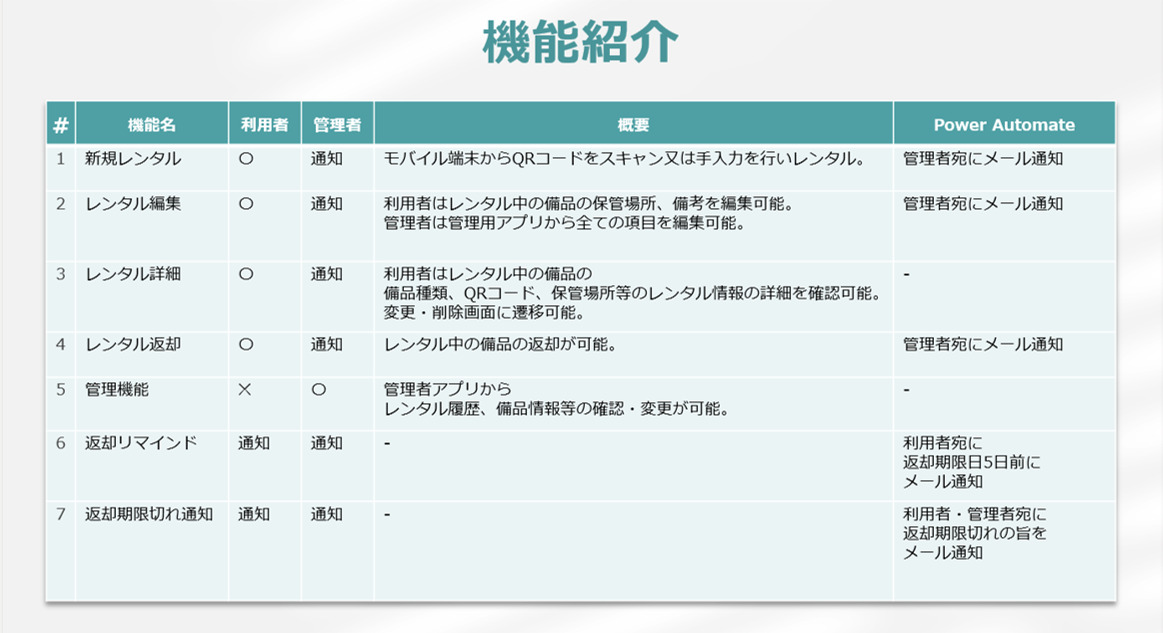 特徴は、事前準備として 管理対象の備品情報をマスタとしてDataverseに事前登録し、テプラで発行したQRコードを備品に貼り付け、 利用者はスマートフォンを用いて備品のQRコードを撮影して借用する点です。 更にで弊社で利用する場合は、「紛失検知 及び 棚卸」を目的として 管理者側から予め「返却期限」を設け、期限が近づくと自動でリマインドメールを配信し 利用者は一度「返却処理」を行った上で、再度備品を借用します。 この際、備品の画像を必須項目とし、紛失の検知をしやすくしています。 こうした各企業の業務プロセスに合わせたシステムの変更がしやすい点は、 やはりローコードプラットフォームの強みであると思います。 備品管理に問わず、ExcelやAccess、専用の外部サービスを利用し、 データ管理を行っている企業も多いと思いますが、管理者、利用者の負担が増える側面もあると思います。 また、専用の外部サービスを利用している場合、サービス利用料だけではなくデータをサービス側が所有する形となる為、 データのサイロ化をなくし一元管理の元、他システム展開やグラフで可視化・分析といったDX推進のハードルが高くなると思います。 そのような中で、Microsoft Power Platformは、ローコードであるだけではなく こうした点を包括的に対応できる形でサービス展開されているのも魅力です。 最後に、本製品のPower Platformサービス構成は下記としています。