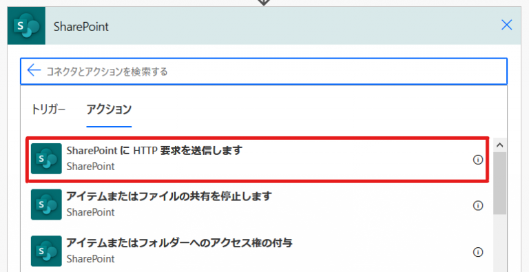 まず使用するのは「SharePoint に HTTP 要求を送信します」アクションです。