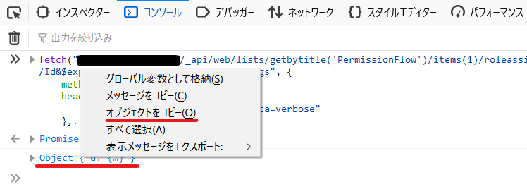 fetch( "<サイトURL>/_api/web/lists/getbytitle('<リスト名>')/items(1)/roleassignments" + "?$select=Member/Title,Member/EMail,PrincipalId,RoleDefinitionBindings/Name,RoleDefinitionBindings/Id" + "&$expand=Member,RoleDefinitionBindings", { method: "GET", headers: { "Accept": "application/json;odata=verbose" }, credentials: 'same-origin' } ).then(response => { return response.json(); }).then(data => { console.log(data); }); |