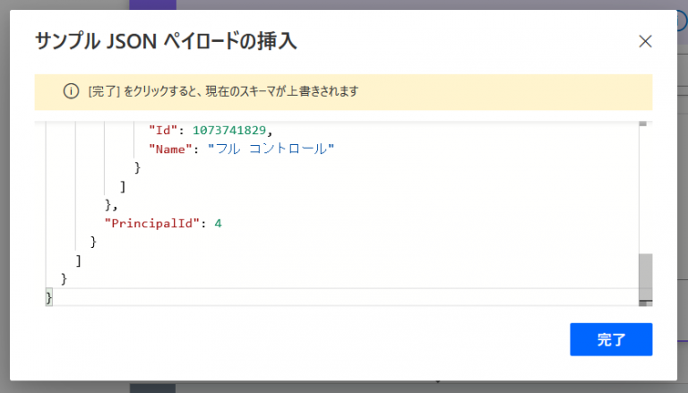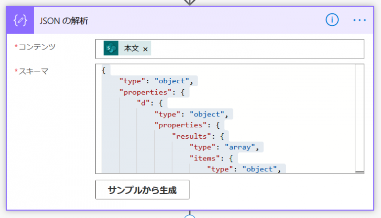 Power Automate の編集画面に戻り、「サンプルから生成」をクリックして表示されたダイアログにコピーを貼り付け、「完了」をクリックします。