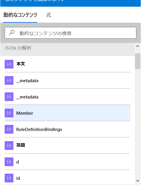 項目ですが、「コンテンツ」には「SharePoint に HTTP 要求を送信します」アクションの「本文」を指定します。
