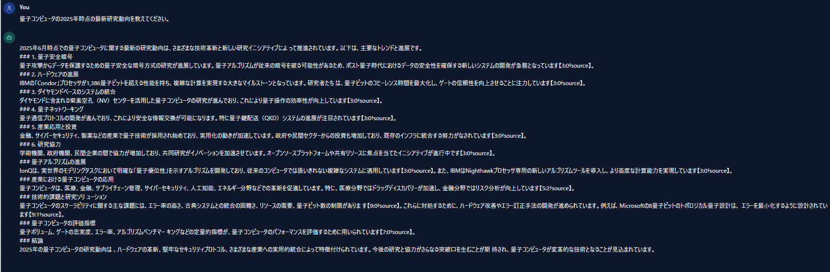 LangChainではGPT-4o-mini、WebResearchで実行したAzureAIAgentではGPT-4oを使用しました。 検索結果から得られたソース情報は、回答内の [Source] リンクで確認可能です。これは複数サイトの情報を統合して応答が構成されていることを示しています。