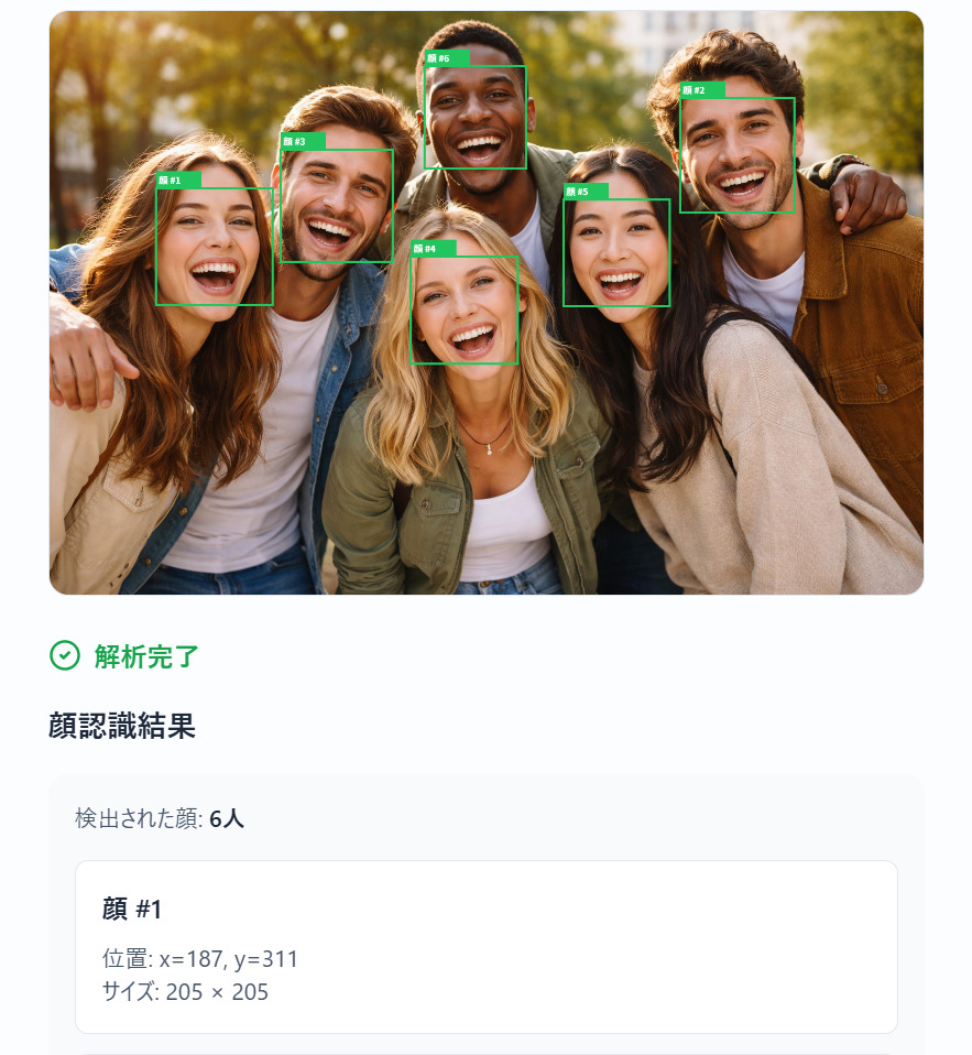 顔認証は、画像の中に写っている「顔」を検出し、その特徴を分析する機能です。※誰の顔かを特定するというより、顔の属性を分析するイメージです。