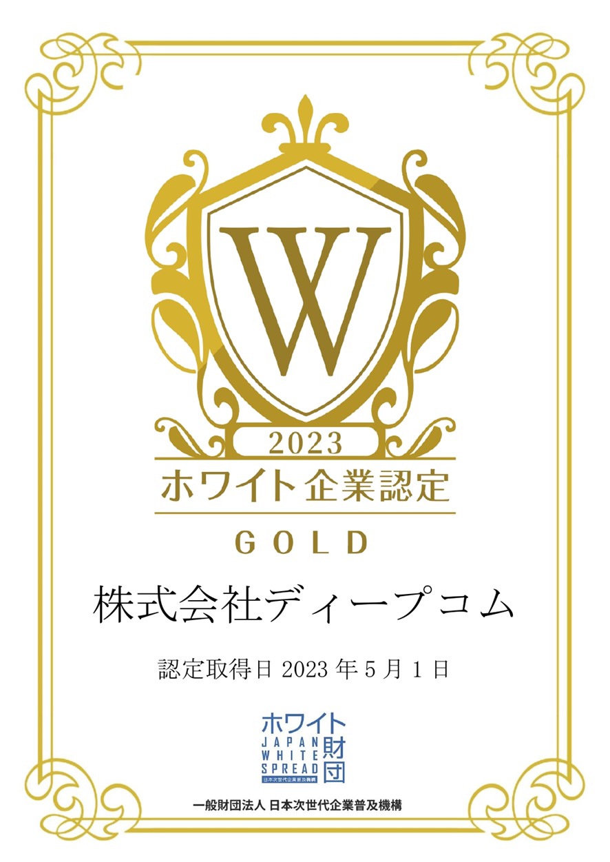 弊社は、2023年5月1日に 一般財団法人日本次世代企業普及機構(通称:ホワイト財団) が認定する「ホワイト企業認定」のゴールドを取得しました。